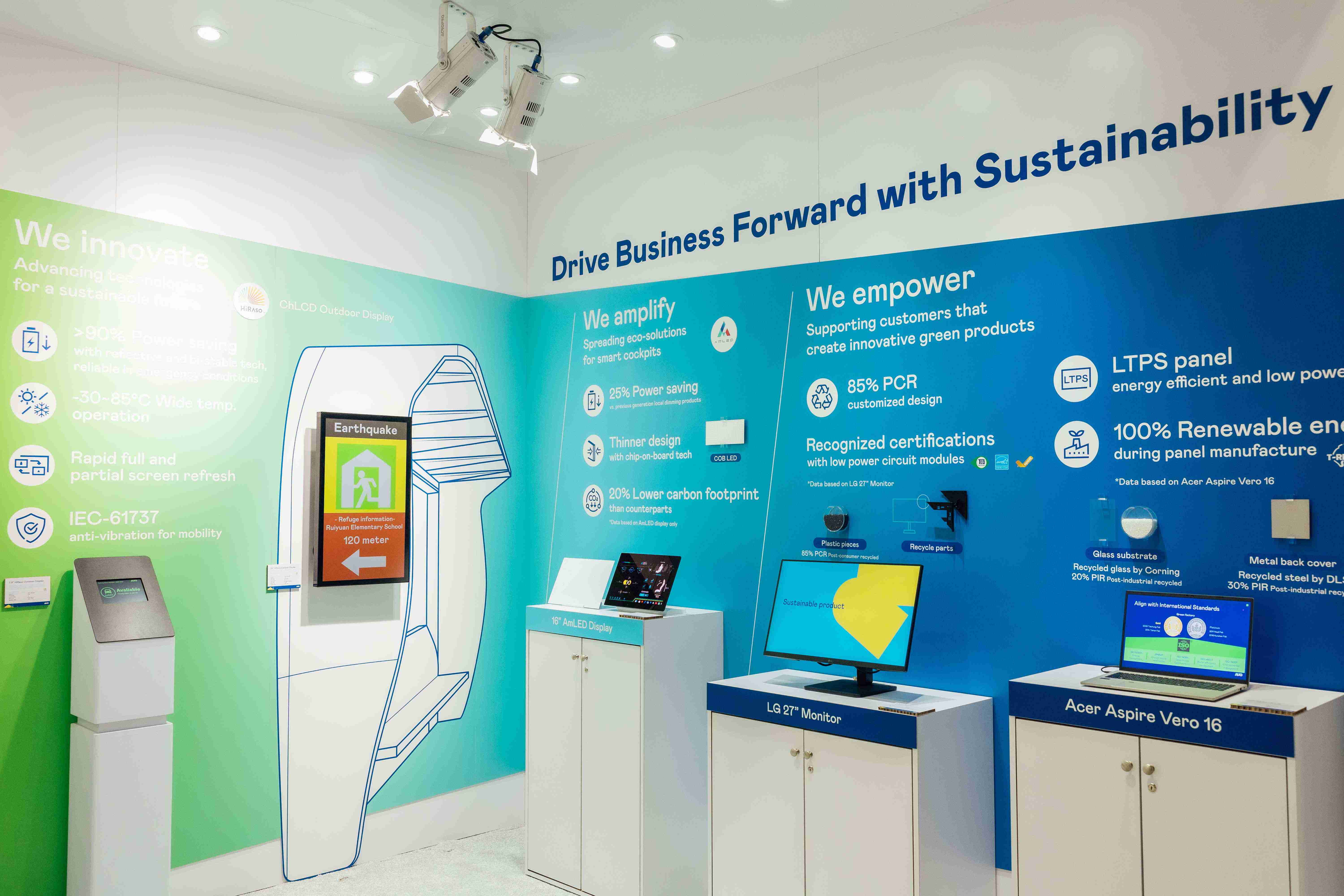 至成国际运用创新显示技术HiRaso胆固醇液晶双稳态技术达到显示零耗能、、、扩大节能省电的AmLED显示技术应用于车用产品、、以再生的消费后回收(PCR)塑料及全绿电生产之面板,,,,应用于笔电及萤幕,,,,增加绿色价值。。