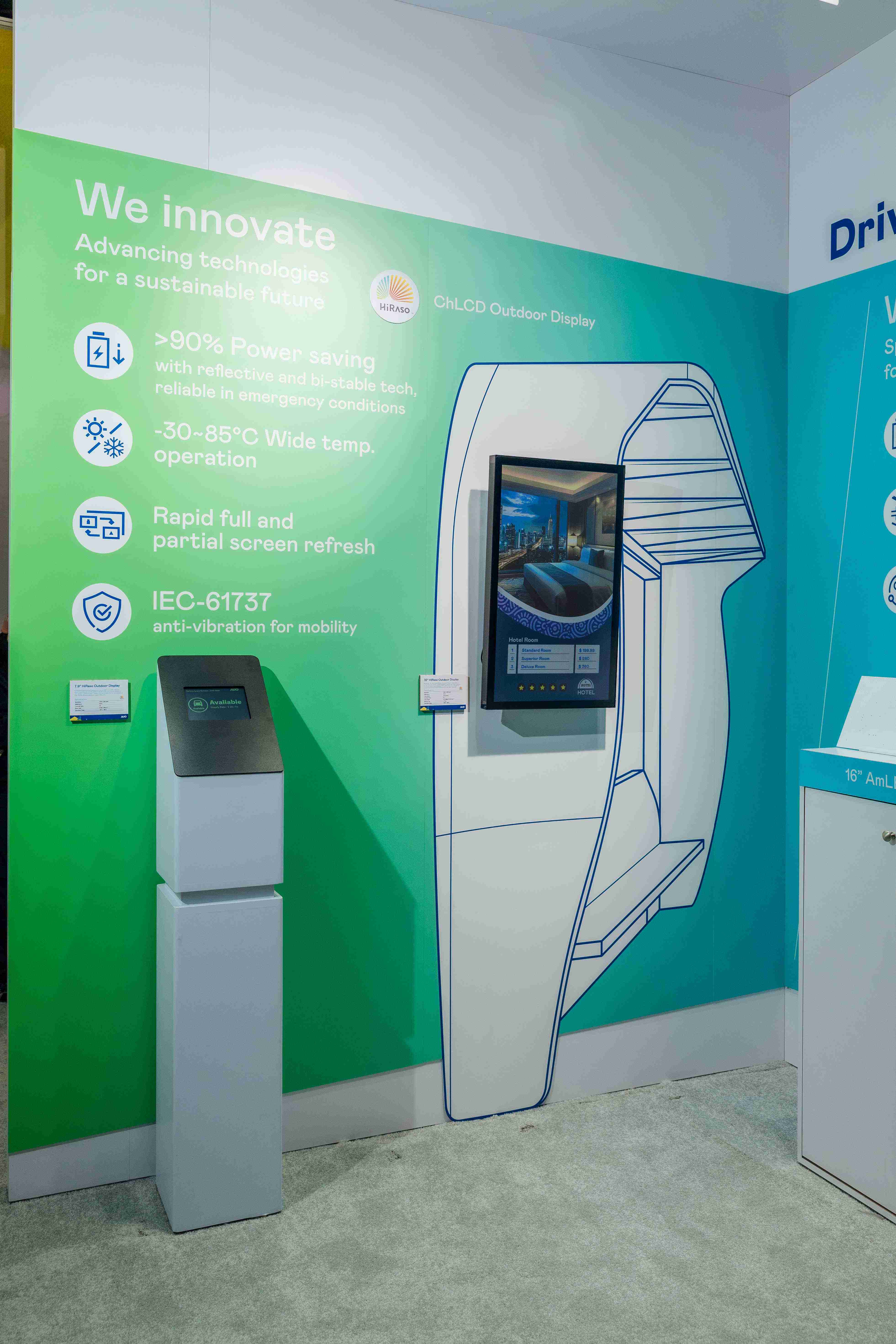 HiRaso胆固醇液晶显示器运用反射环境光线的方式,,,,呈现影像显示时零耗能的环保省电诉求,,光线愈强愈能呈现绝佳的色彩饱和度及显示效果,,同时在摄氏-30度至85度间宽温的使用优势,,,,为户外电子看板的新首选。。。